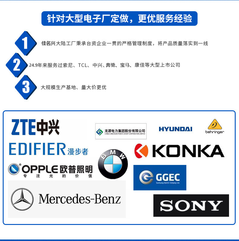 2017年12月28日正式更名為深圳佳名興電容有限公司 佳名興JMX廣東省惠州市電容器工廠占地面積13149平米,廠房面積8227平方米,每年生產(chǎn)的超級電容(單體、模組、方案定制)薄膜類電容(包括:金屬化薄膜電容、軸向薄膜電容,工業(yè)級電源用薄膜電容、長壽命薄膜電容、等)軸向鋁電解電容、電力電容器、雙面金屬化薄膜電容等被動元器件達(dá)8-13億只 佳名興JMX電容器60%-70%以上產(chǎn)品出口歐美,印度,東南亞等世界各地,30%-40%銷往中國大陸,產(chǎn)品規(guī)格齊全,體積小,可靠性優(yōu)良,穩(wěn)定性好,價格合理 佳名興JMX電容器被廣泛用于:汽車音響,車載分音器,音響分頻器,專業(yè)音響功放,衛(wèi)星通訊設(shè)備,LED驅(qū)動電源,LED節(jié)能燈,開關(guān)電源及電腦周邊產(chǎn)品等各個電子行業(yè)