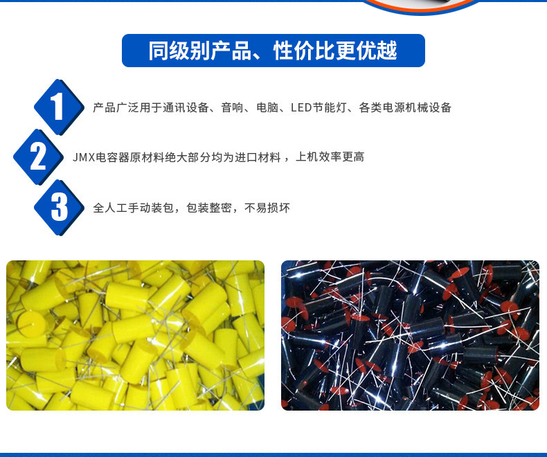 JMX電容為上千家客戶提供電容近20年,JMX電容已成為優(yōu)質(zhì)的電容供應(yīng)商之一,熱誠歡迎各界朋友蒞臨佳名興電容器工廠參觀,指導(dǎo)和業(yè)務(wù)洽談。電容器訂購熱線:+86 13927412413,了解電容器參數(shù):www.czyzf.com |