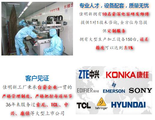 2017年12月28日正式更名為深圳佳名興電容有限公司 佳名興JMX廣東省惠州市電容器工廠占地面積13149平米,廠房面積8227平方米,每年生產(chǎn)的超級電容(單體、模組、方案定制)薄膜類電容(包括:金屬化薄膜電容、軸向薄膜電容,工業(yè)級電源用薄膜電容、長壽命薄膜電容、等)軸向鋁電解電容、電力電容器、雙面金屬化薄膜電容等被動元器件達(dá)8-13億只 佳名興JMX電容器60%-70%以上產(chǎn)品出口歐美,印度,東南亞等世界各地,30%-40%銷往中國大陸,產(chǎn)品規(guī)格齊全,體積小,可靠性優(yōu)良,穩(wěn)定性好,價格合理 佳名興JMX電容器被廣泛用于:汽車音響,車載分音器,音響分頻器,專業(yè)音響功放,衛(wèi)星通訊設(shè)備,LED驅(qū)動電源,LED節(jié)能燈,開關(guān)電源及電腦周邊產(chǎn)品等各個電子行業(yè)